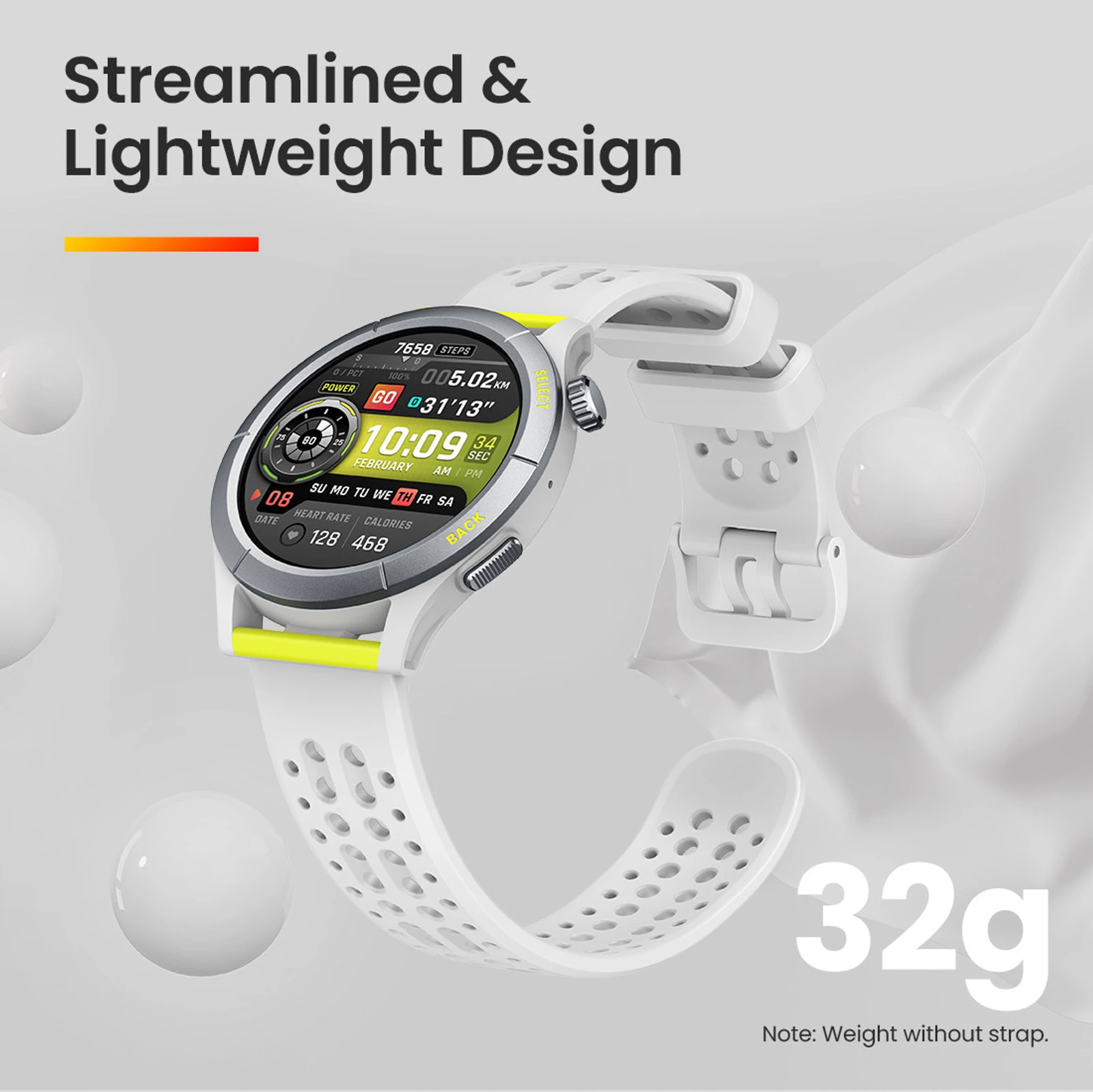 UltraโLightweight, Ergonomic Design: Weighing justย 32gย (without the strap) and measuring 9.9mm thick, theย Amazfit Cheetah (Round) Smartwatchย is crafted from a fibreโreinforced polymer with a metallic bezel. The breathable silicone strap and intuitive button controls (including a digital crown) ensure allโday comfort and easy operation, even during intense workouts-1-6-11.