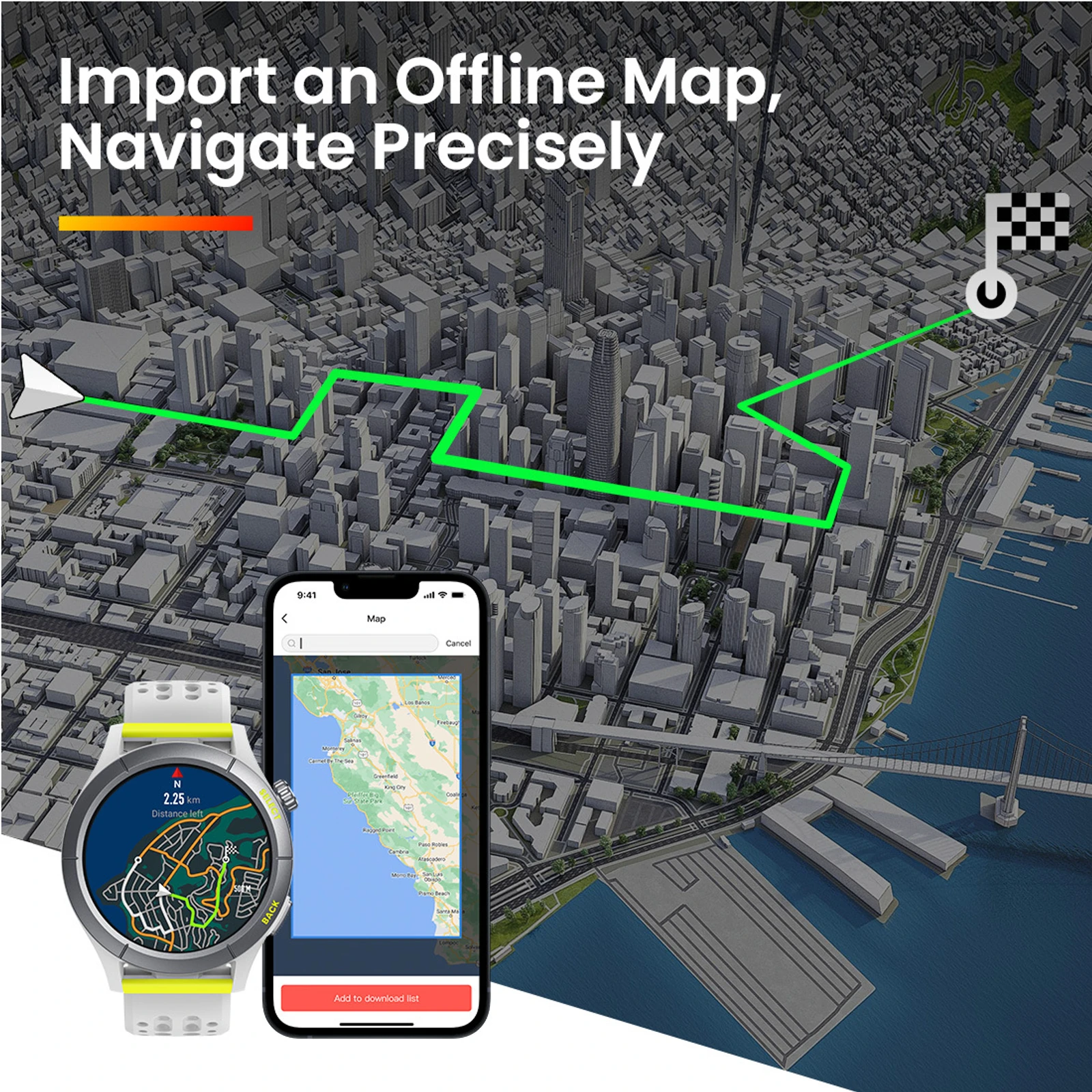 Offline Maps & Route Navigation: Import colour offline maps and GPX route files directly from the Zepp App to theย Amazfit Cheetah (Round) Smartwatch. Navigate unfamiliar trails or urban runs with turnโbyโturn directions, all without needing your phone-6.
